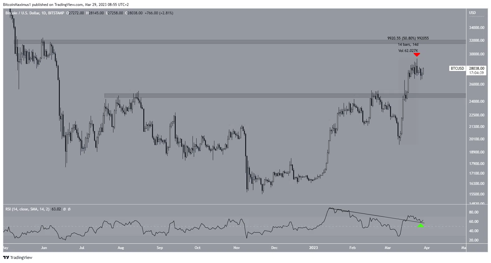Le cours Bitcoin s’est accru rapidement à partir du 10 mars. En l’espace de 14 jours, il s’est accru de près de 50 %. Ce, jusqu’à atteindre un sommet annuel de 29 380 $. Cela dit, depuis, le cours a formé un chandelier baissier et a légèrement rechuté (flèche rouge).