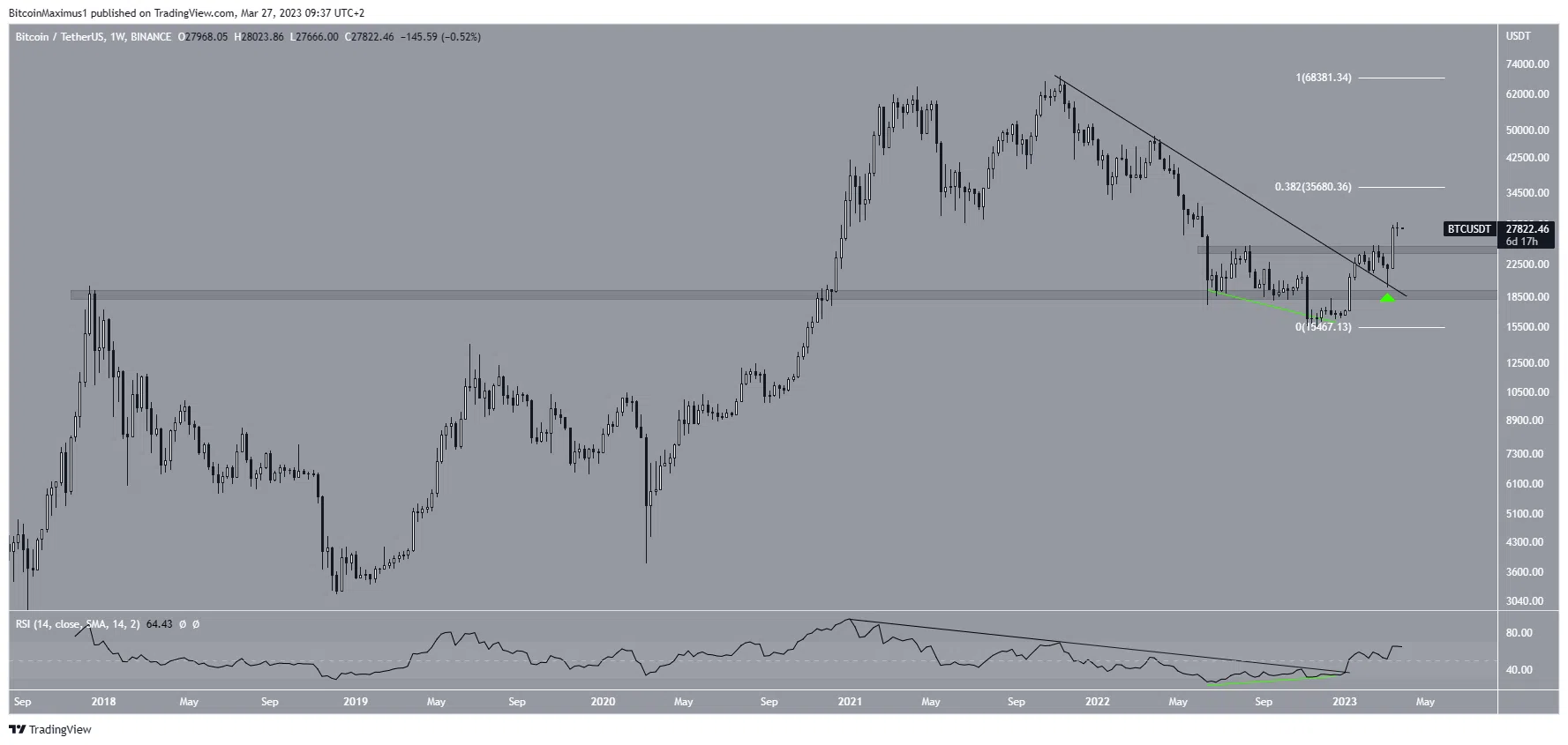 Bien que les graphiques quotidiens et sur six heures présentent des donnés contradictoires, le graphique hebdomadaire de Bitcoin présente pour sa part des perspectives haussières. Ce, pour plusieurs raisons.