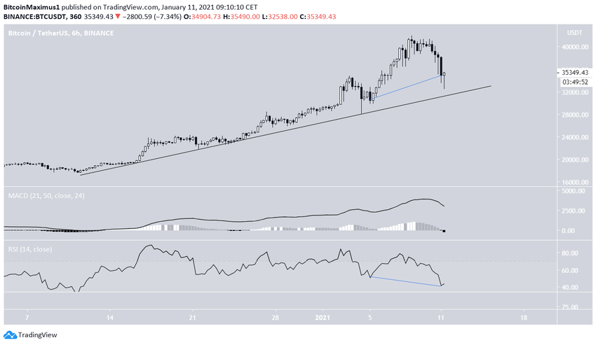 Le graphique sur six heures est plus haussier, car il montre à la fois une ligne de support ascendante, ainsi qu’une divergence haussière dissimulée dans le RSI.