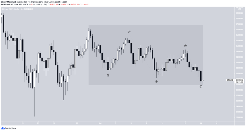 Le graphique sur deux heures montre que le BTC s’échange au sein d’un canal parallèle descendant depuis le 29 juin. Ce type de schéma contient généralement des structures correctives. De plus, le mouvement à l’intérieur de ce canal semble extrêmement graduel et saccadé, réduisant la possibilité qu’il fasse partie d’une impulsion baissière.