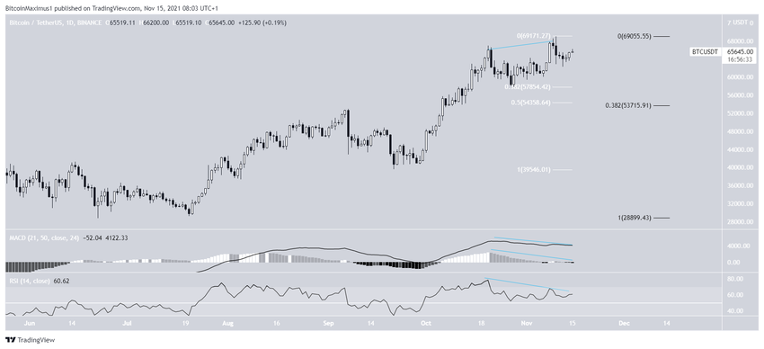 Le graphique journalier montre que le BTC évolue à la baisse depuis le 10 novembre, après avoir atteint un nouveau prix record de 69 000 dollars à cette même date.