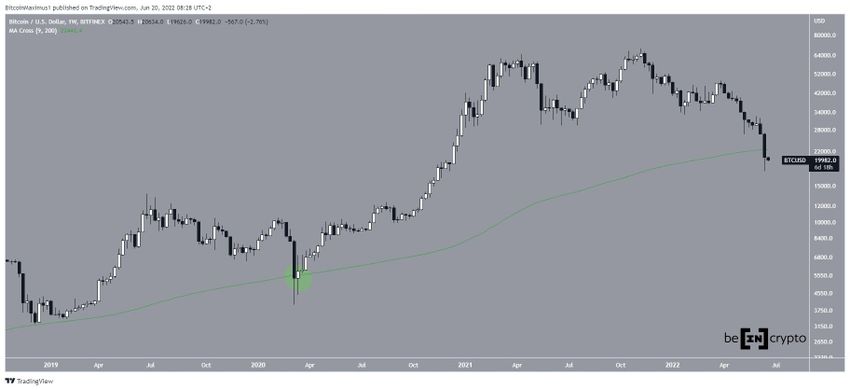 Il est important de noter que le cours a atteint une clôture hebdomadaire en-dessous de sa moyenne mobile (MA) sur 200 semaines. Bien que cela se soit déjà produit en mars 2020 (cercle vert), le BTC n’est jamais resté sous cette MA pendant une durée prolongée.