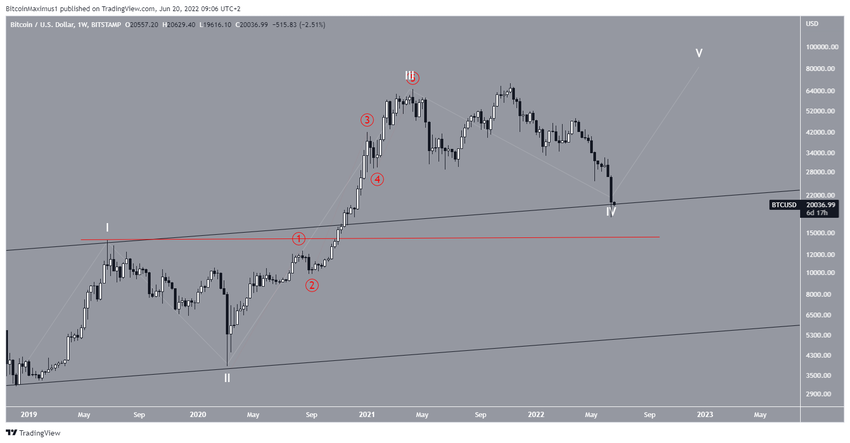 L’option la plus haussière suggère que Bitcoin s’approche du plancher de la quatrième vague (en blanc) d’un mouvement haussier en cinq vagues démarré en mars 2020.