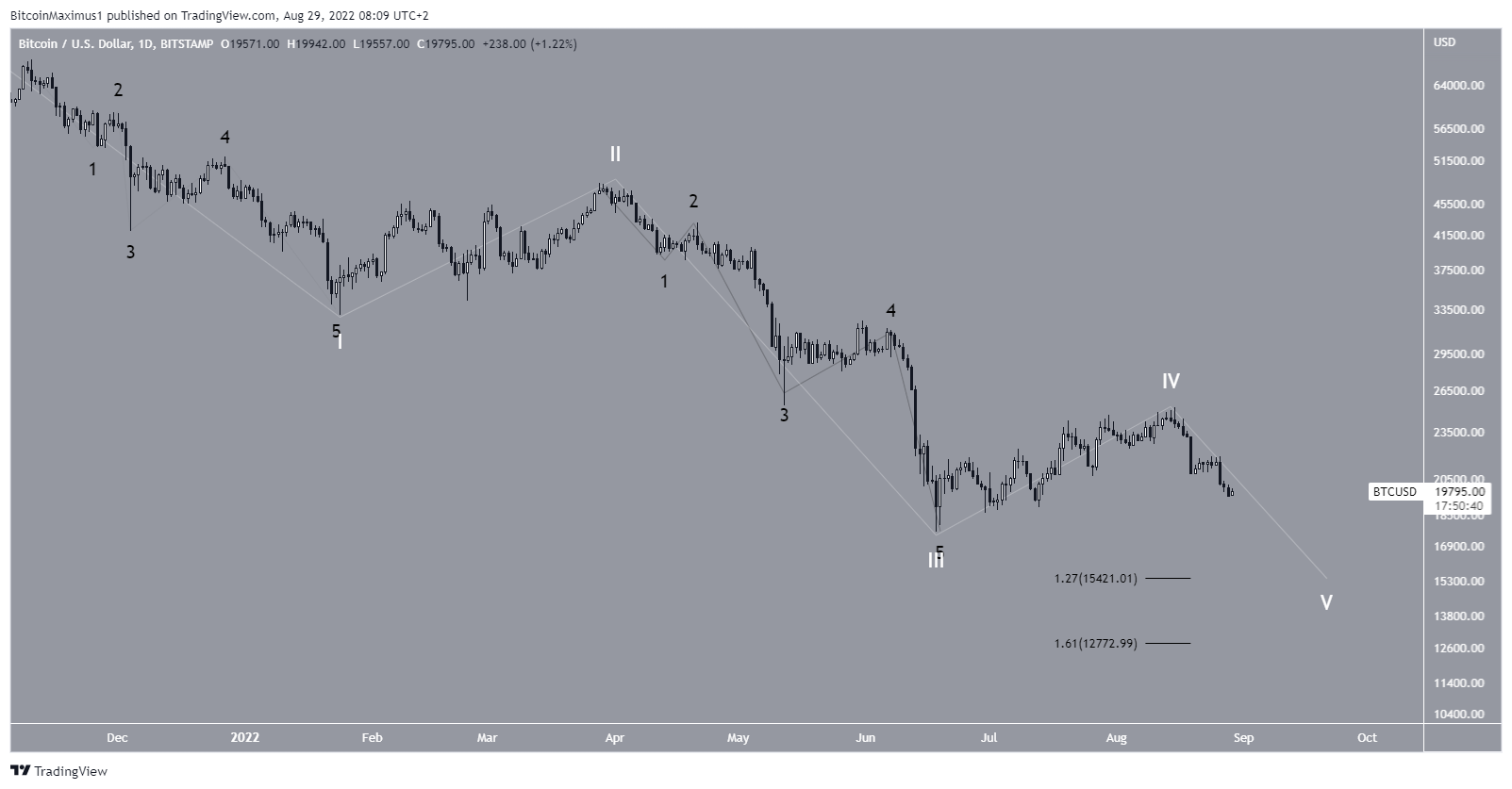 En utilisant un retracement externe sur la vague quatre, les deux objectifs les plus plausibles pour le plancher du mouvement se trouvent à 15 400 $ et 12 700 $. Ces objectifs correspondent au niveaux respectifs de retracements externes de Fibonacci 1,27 et 1,61.