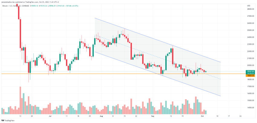 Le cours se trouve actuellement dans la partie inférieure de cette fourchette, mais en a de nouveau atteint la ligne de tendance baissière. Un passage du cours au-dessus de la ligne de résistance diagonale ou, au contraire, une chute sous le support horizontal situé à 18 800 $ déterminera probablement la direction de la prochaine tendance.