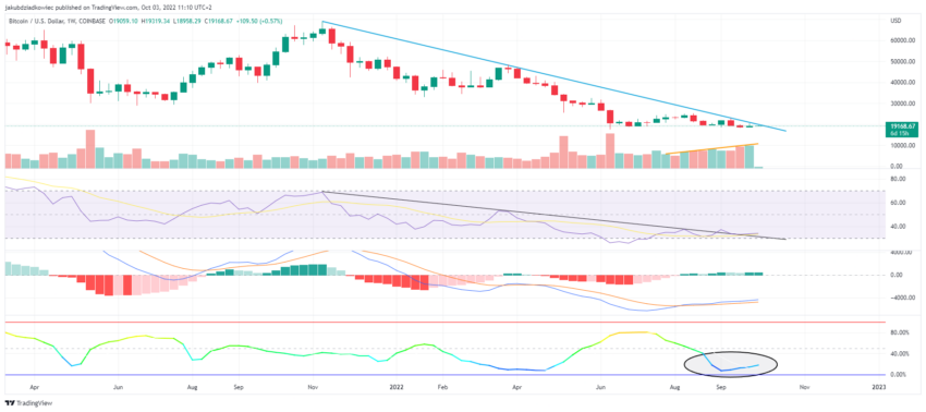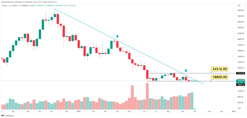 Sur le graphique hebdomadaire, nous observons que le BTC décline le long d’une ligne de tendance descendante (en bleu), laquelle a rejeté le cours à deux reprises en avril et en septembre (flèches bleues). De plus, jusqu’au creux de juin, le cours de Bitcoin s’est consolidé dans la fourchette de 18 880 $ à 24 316 $.
