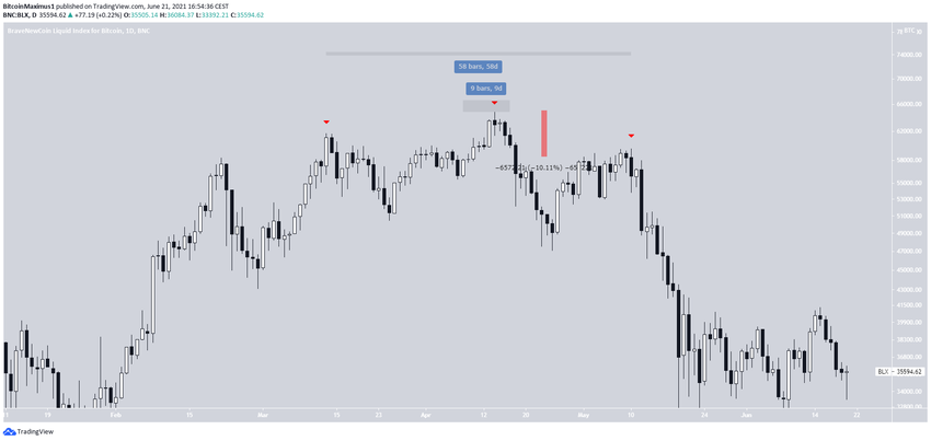 Le cours de Bitcoin a tourné autour de cette marge de 10% de moins du sommet durant 58 jours, soit du 14 mars au 10 mai. Bien qu’il y ait eu plusieurs déviations en-dessous de cette marge, le cours y est finalement revenu. Même le sommet du mois de février n’était que 11% en-dessous du sommet maximum en date.