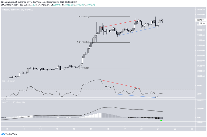 Lorsque le BTC a passé la barre des 24 000$, le graphique sur deux heures a commencé à montrer des faiblesses. Le RSI a généré une divergence baissière (ligne rouge) et la MACD était en déclin. Cela a semblé indiquer qu’un déclin vers le niveau de retracement fibonacci 0,5, à 21 785$, pourrait avoir lieu.