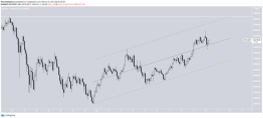 Une observation plus poussée du mouvement montre que le BTC s’échange au sein d’un canal parallèle ascendant depuis le 28 février. Les canaux parallèles sont souvent des mouvements correctifs, ce qui signiferait qu’un passage en-dessus du canal est à prévoir.