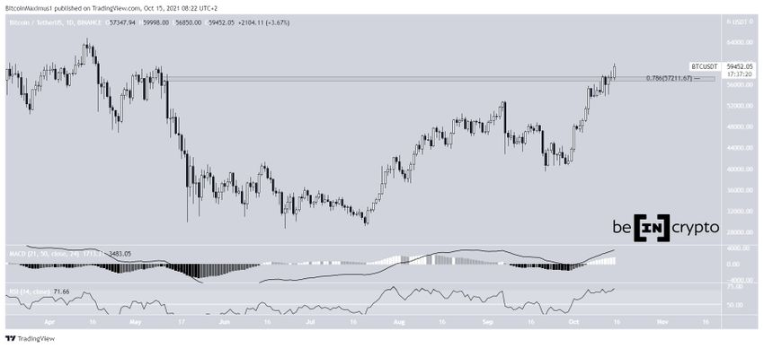 Le 14 octobre, le cours de Bitcoin a finalement clôturé au-dessus de la zone de résistance horizontale située à 57 200 $. Le lendemain, il a amorcé un considérable mouvement de hausse. Il s’agit d’un développement crucial, sachant que cette zone correspond à la dernière résistance avant le prix record du BTC. De plus, il s’agit de la résistance du retracement de Fibonacci 0,786.