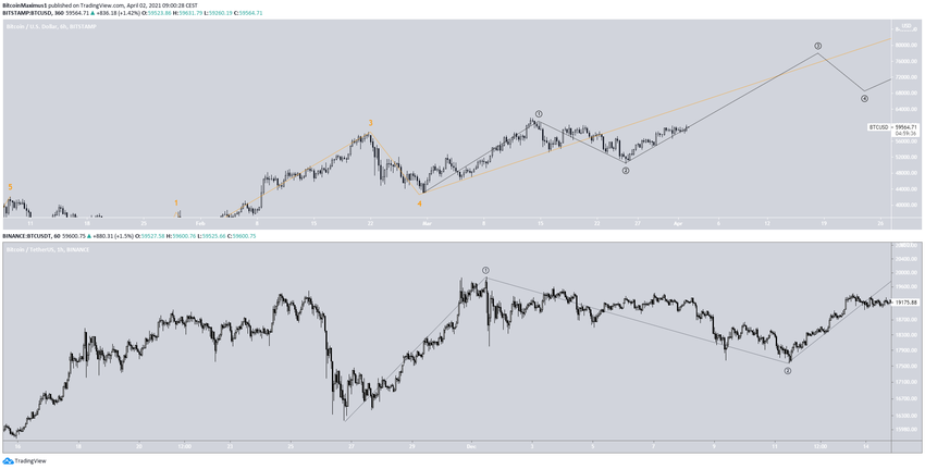 Le décompte de vagues suggère que Bitcoin est dans la vague cinq (en blanc) d’une impulsion haussière démarrée en mars 2020.