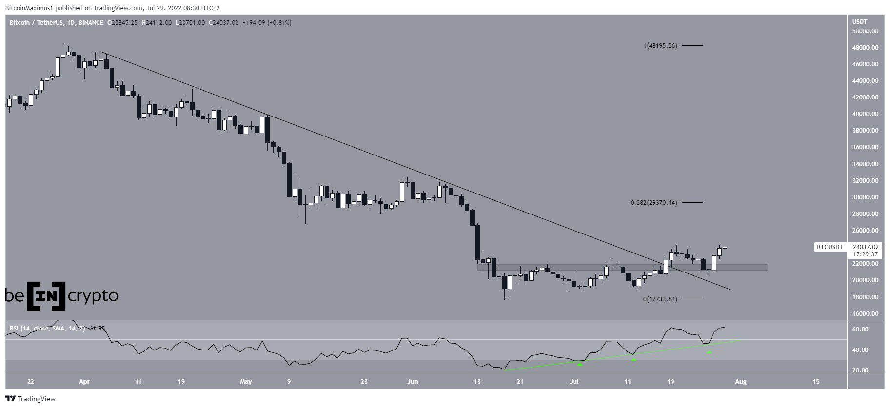 Le BTC s’est depuis accru et a dépassé cette ligne le 18 juillet. Le cours a d’abord décliné, mais il a ensuite validé la zone de support horizontal des 21 600 $ le 26 juillet et a ensuite accéléré sa hausse. Il a jusque-là atteint un sommet local de 24 442 $.