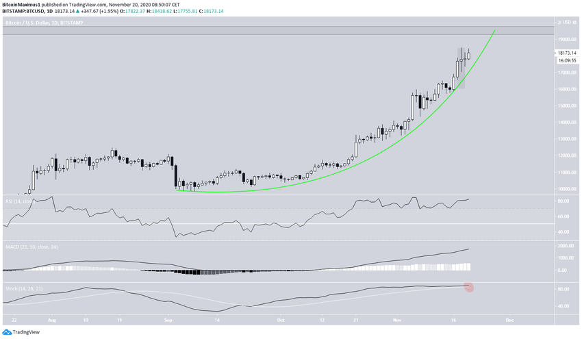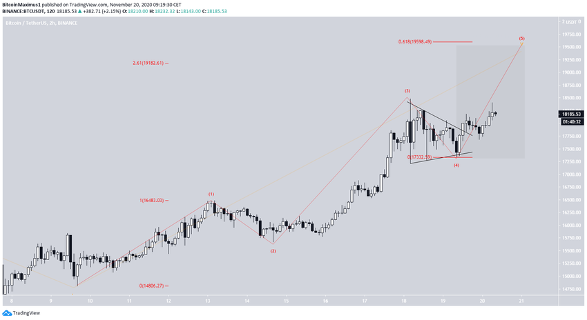 Dans le décompte de vagues de BeInCrypto.com du 19 novembre, le décompte de long terme a montré que le cours est probablement dans la cinquième et dernière vague d’une impulsion haussière démarrée en mars. Il suggère également un sommet près des 20 000 dollars.