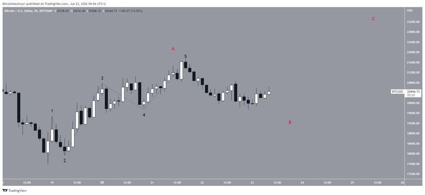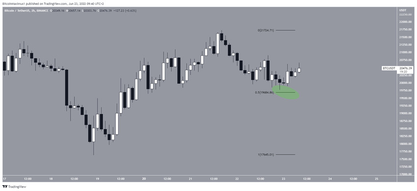 Le graphique sur deux heures montre que le BTC a rebondi au niveau de la résistance de Fibonacci 0,5 à 19 700 $ (cercle vert) et qu’il se trouve en passe de générer son premier creux supérieur.