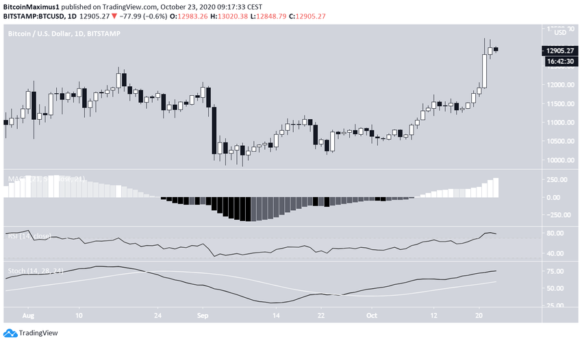 Le 23 octobre, Bitcoin a continué son mouvement ascendant en créant un autre chandelier haussier, légèrement plus petit que la chandelle précédente. De plus, le sommet de la mèche du 23 octobre, situé à 13 208$, était légèrement inférieur à celui du 22 octobre, situé à 13 235$.