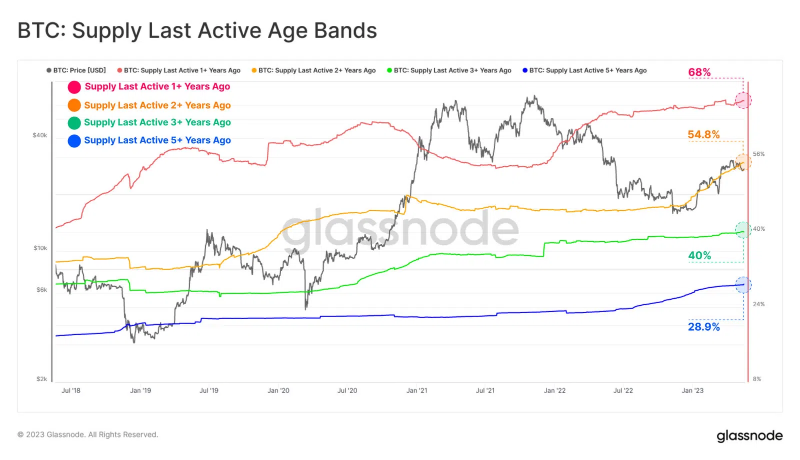 Comme le montre le graphique ci-dessus, la plupart des BTC inactifs n’ont pas bougé depuis 2021, soit juste avant le bull market qui a propulsé le cours Bitcoin à un sommet historique de 69 000 $.