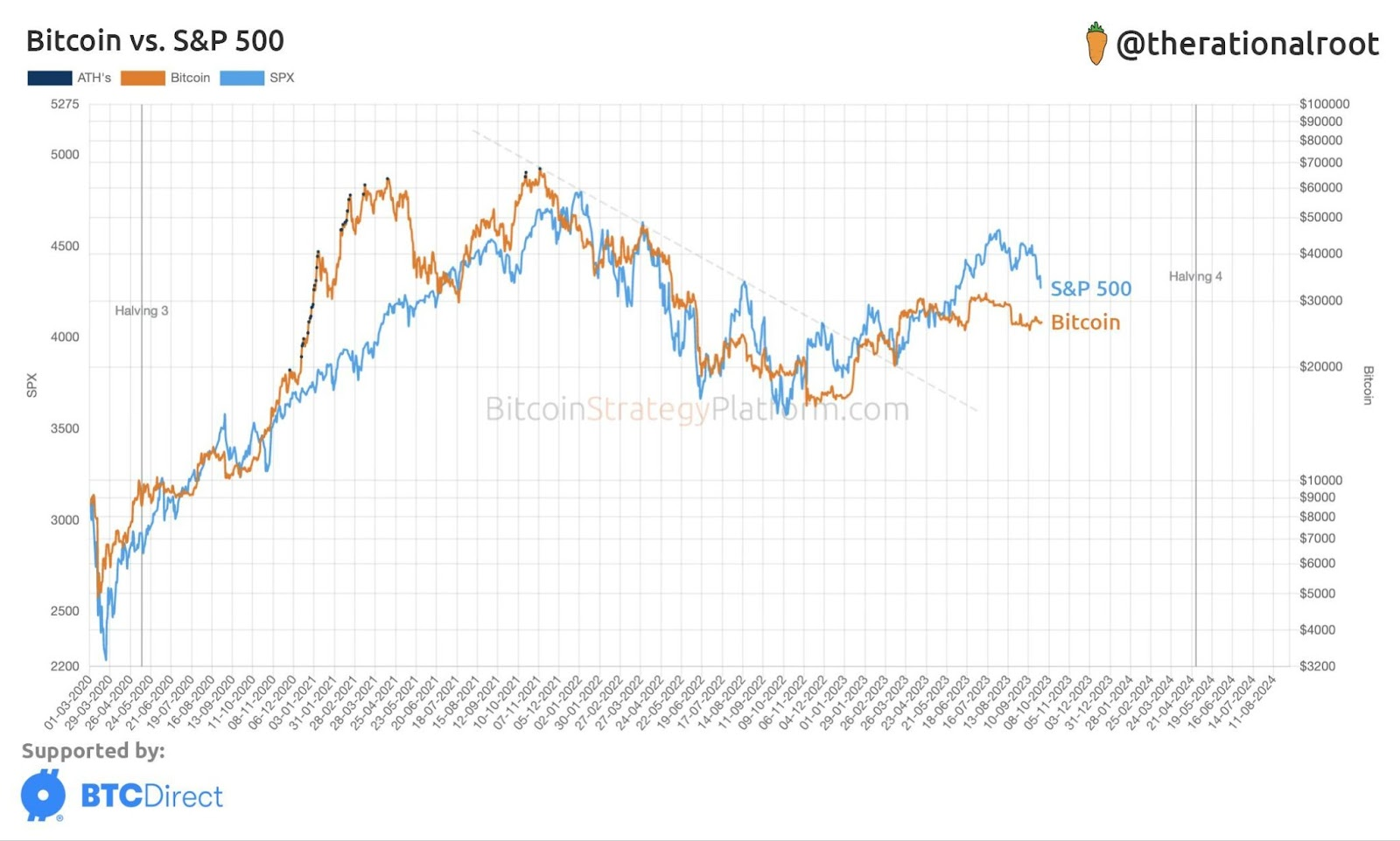 SponsoredD’après l’analyste crypto @therationalroot, le S&P 500 (bleu) et Bitcoin (orange) semblent très proches depuis 2020.