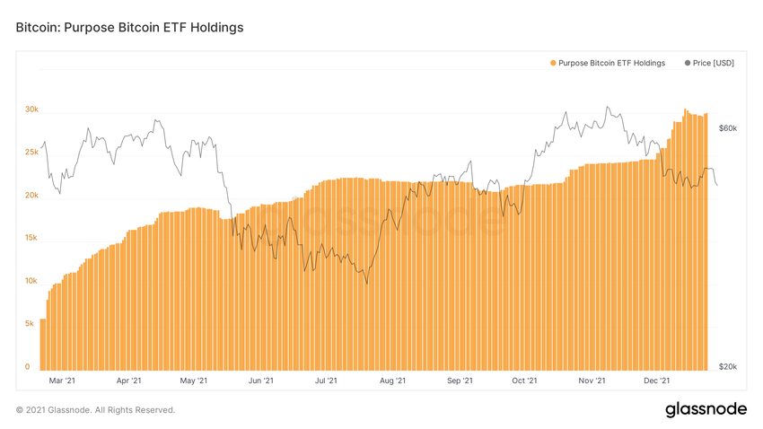 Les avoirs de l’ETF [fonds négocié en bourse] Bitcoin Purpose se sont considérablement accrus depuis le début du mois de décembre. Cela signifie que malgré le déclin du cours du BTC, les institutions achètent l’actif à la baisse, plus spécifiquement alors que son prix se situe entre 47 000 $ et 53 000 $.