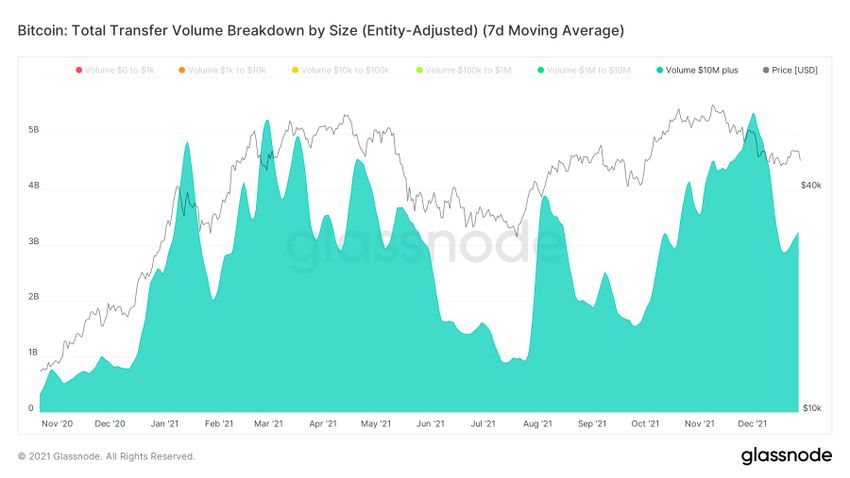 L’analyste on-chain @Wclementelll a publié sur Twitter plusieurs graphiques, lesquels montrent que les institutions ont été plus actives au sein du marché en comparaison des investisseurs particuliers. Cela est visible du fait que le volume de transferts entre 10 000 $ et 100 000 $ a chuté, tandis que ceux de plus de 10 000 000 $ ont augmenté.