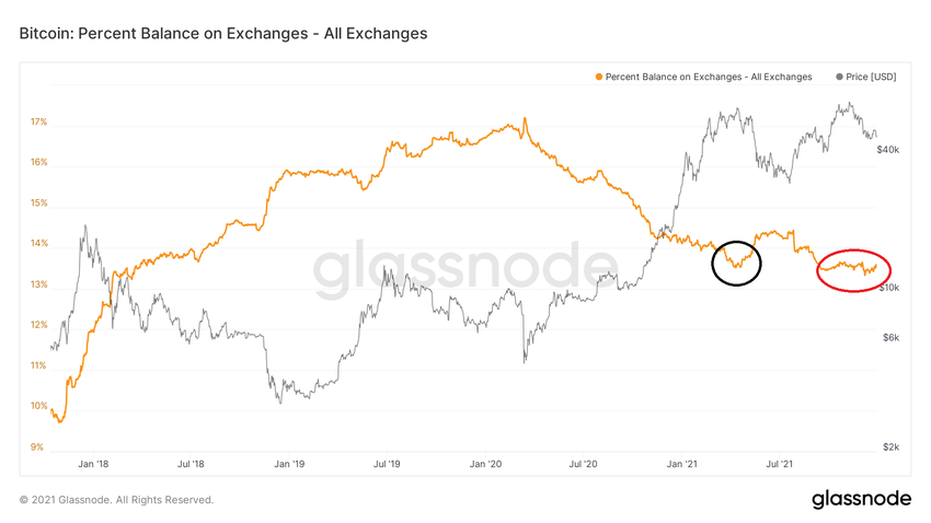 Malgré un rebond initial, l’indicateur a continué à chuter et a atteint un nouveau creux annuel de 13,4% (cercle rouge). Cela signifie que les investisseurs gardent probablement leurs BTC dans des portefeuilles de stockage à froid. Ce genre de situation est généralement considéré comme un signe haussier, sachant qu’il indique une conviction au sein du marché.