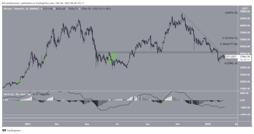 Le cours de Bitcoin décline sous une ligne de résistance descendante depuis son sommet historique du 10 novembre 2021. Cette ligne a rejeté le BTC à quatre reprises (flèches rouges), la plus récente remontant au 4 février. Cependant, sachant que les résistance s’afaiblissent à chaque fois que le cours les atteint, il serait probable que le BTC finisse par la dépasser.