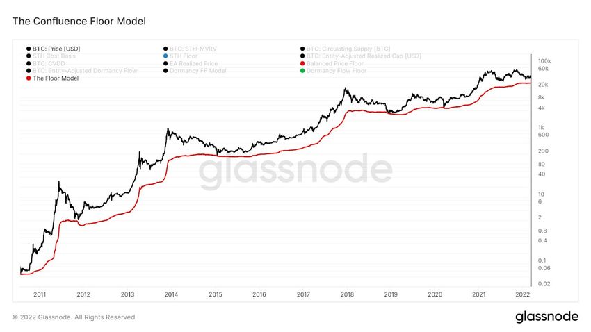 Ensuite, l’auteur de l’indicateur a attiré l’attention sur la précision historique du modèle du plancher de confluence en fournissant des détails sur trois planchers macros historiques du prix du BTC. Il s’agit des points bas des marchés baissiers de 2014/15 et 2018/19, ainsi que du crash dû à la COVID-19, qui a eu lieu en mars 2020. Fait intéressant, dans aucun de ces cas, le cours n’a clôturé en dessous de la valeur indiquée par le modèle.
