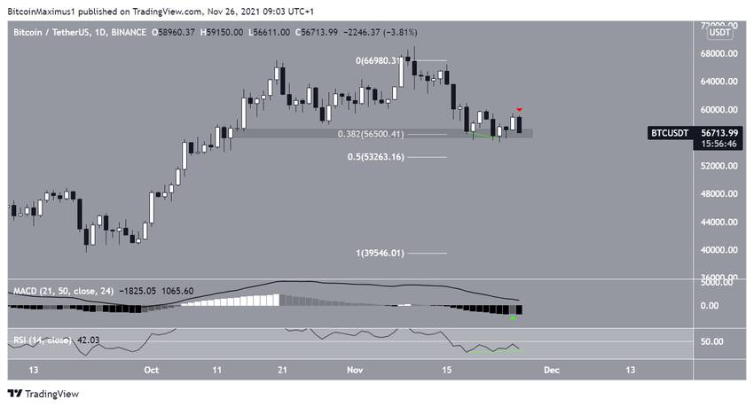 Depuis le 19 novembre, le cours de Bitcoin plane au-dessous du support des 56 500 $. Il s’agit à la fois d’une zone de support horizontal ainsi que du retracement de Fibonacci 0,382.