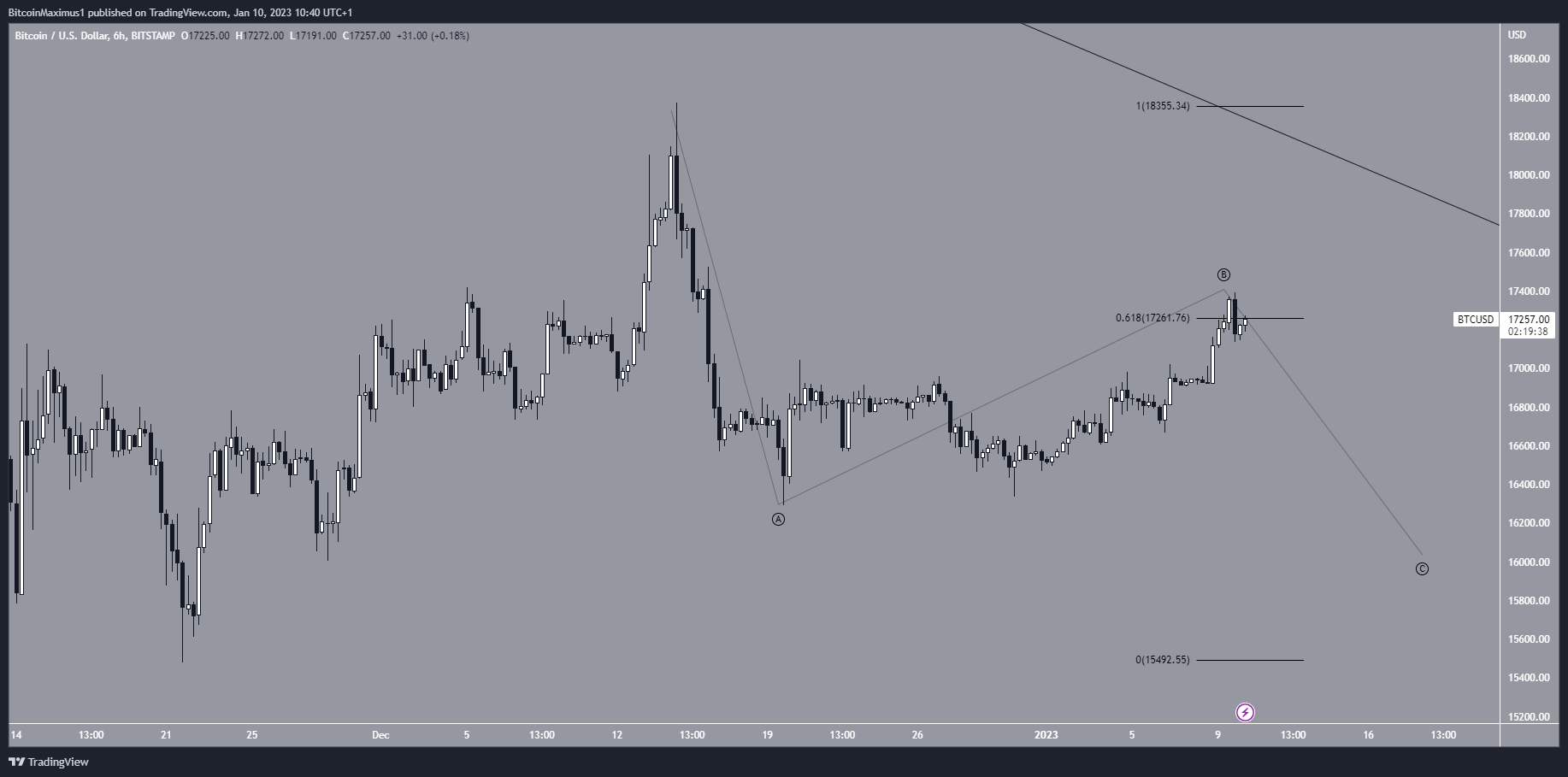 Actuellement, le cours du BTC se trouve au niveau de la résistance du retracement de Fibonacci 0,618, à 17 260 $. S’il subit un rejet à ce niveau, le cours pourrait alors chuter et ainsi compléter sa vague C.