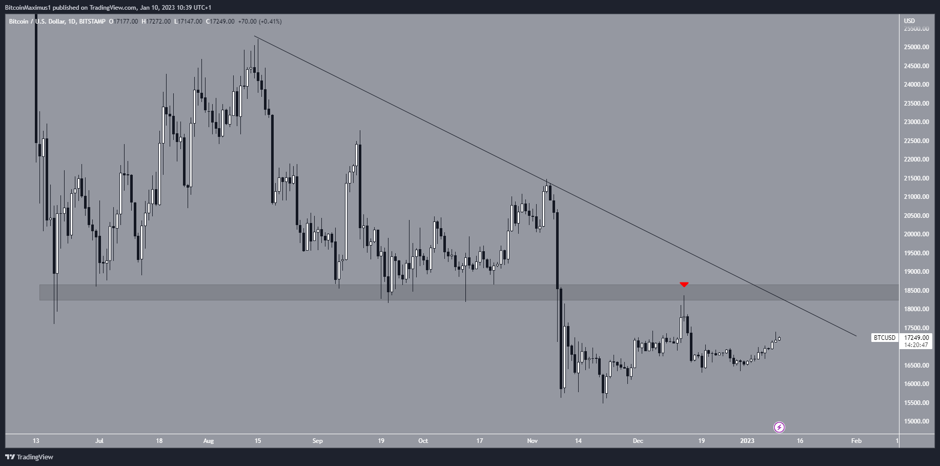 Le cours de Bitcoin (BTC) évolue sous une confluence de résistances critiques située à 18 500 $. Il lui faudra dépasser cette zone afin de pouvoir présenter des perspective haussières sur le mois de janvier ainsi que sur le long terme.