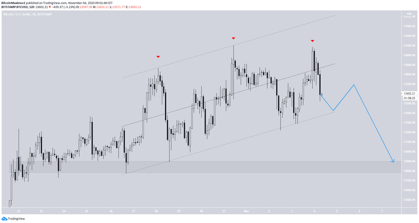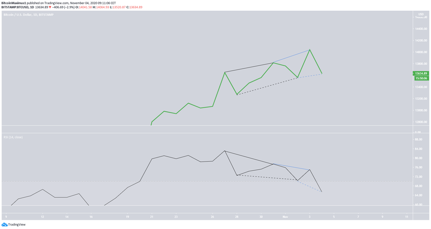 Le 3 novembre, le cours de Bitcoin (BTC) s’est considérablement accru pour atteindre un autre sommet au-dessus des 14 000$. Il n’a cependant pas pu se maintenir à ce niveau supérieur et a rechuté peu après.