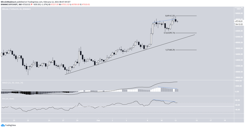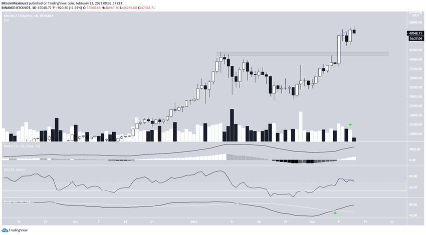 Le 11 février, le BTC s’est légèrement accru, créant au passage un chandelier de recouvrement haussier. Le lendemain, il a atteint un nouveau sommet historique à 48 985$.