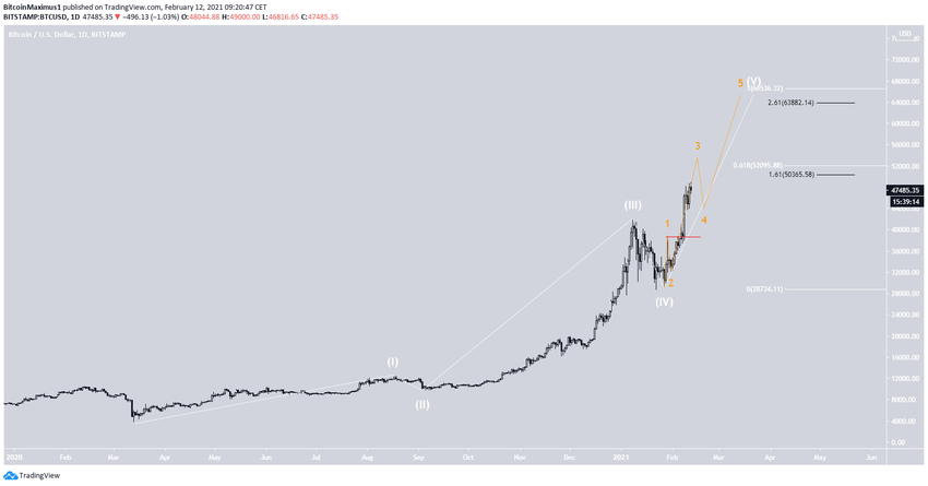 Le décompte de vagues suggère que le BTC est dans la vague cinq (en blanc) d’une impulsion haussière démarrée en mars 2020.