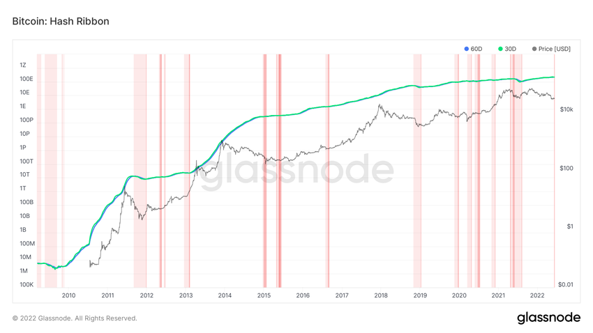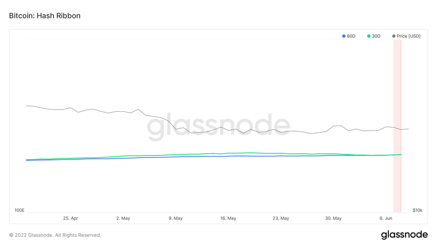 L’indicateur en ruban indique si les mineurs ont capitulé, ce en utilisant le taux de hashage. Il est dit que les mineurs capitulent lorsque leurs coûts de minage crypto sont plus élevés que leurs récompenses.