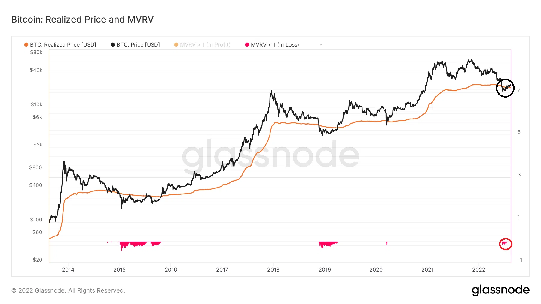 Bien que le BTC soit passé sous son prix réalisé, il a maintenant retrouvé ce dernier (cercle noir), qui est actuellement de 21 700 $. Dans l’histoire de Bitcoin, une fois que le prix réalisé est récupéré, le cours n’est jamais redescendu sous ce dernier avant d’initier une hausse significative.