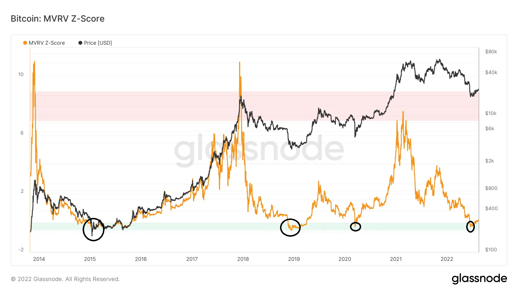 De plus, la durée pendant laquelle le MVRV s’est révélé négatif (cercle rouge) était d’environ 40 jours, soit un durée plus longue qu’en mars 2020 mais plus courte qu’en décembre 2018 et janvier 2015.