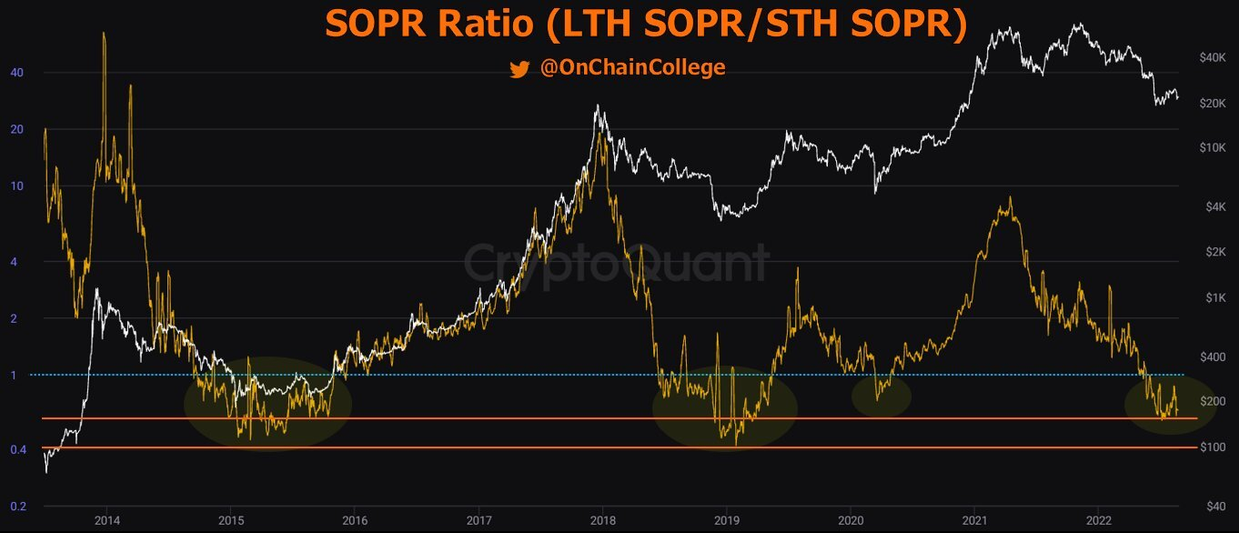 Le ratio SOPR est un autre dérivé de l’indicateur du même nom. Il indique le rapport entre la valeur de l’indicateur pour les détenteurs de long terme de Bitcoin (LTH, de l’anglais long-term holder) et les détenteurs de court terme (STH, de l’anglais short-term holder).