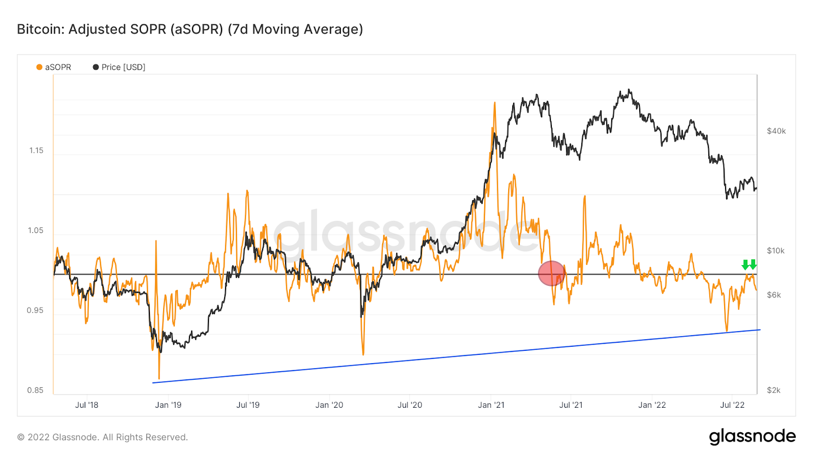 Pour une plus grande précision des mesures sur le long terme, on a également utilisé l’indicateur SOPR ajusté (aSOPR). Ce dernier ne prend pas compte des données sur les sorties (ou dépenses) dont la durée de vie est inférieure à 1 heure.