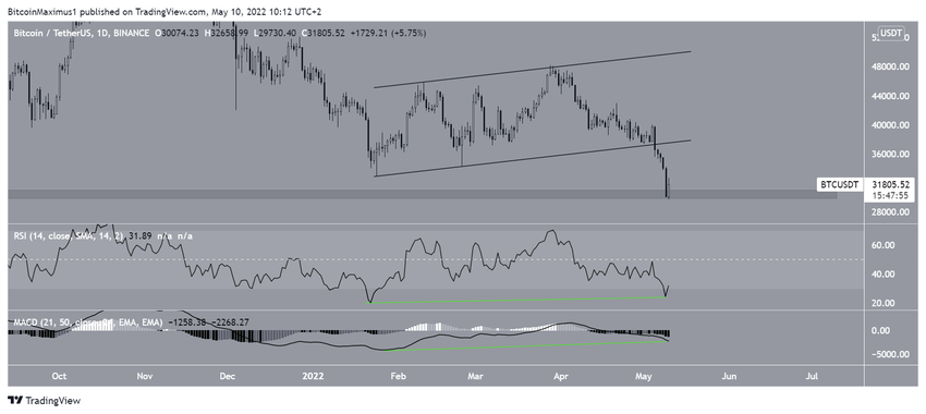 Le BTC a atteint un creux local de 29 730 $ le 10 mai et a ensuite rebondi, validant la zone horizontale des 30 500 $ en tant que support. Cette zone n’a pas été testée depuis juillet 2021.
