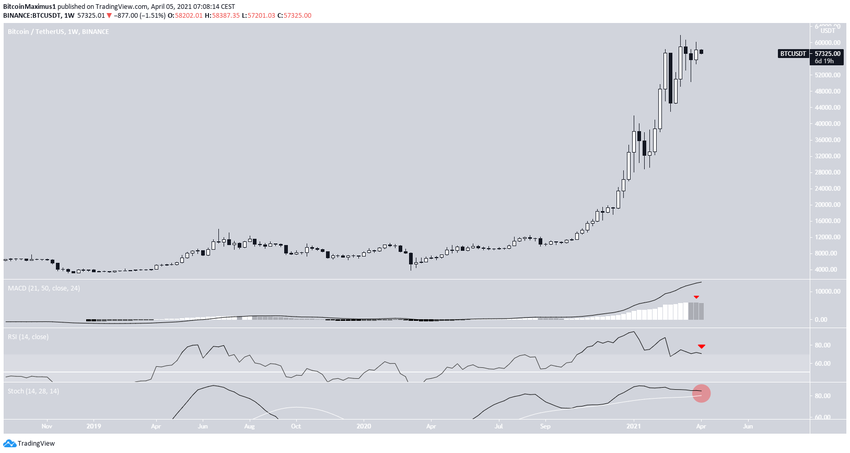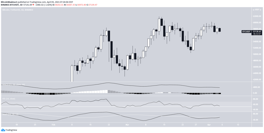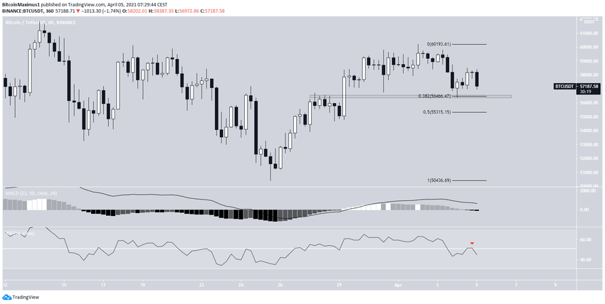 Il est donc possible qu’une chute ait lieu jusqu’au niveau de support du retracement fibonacci 0,5, situé à 55 300$, avant que le cours reprenne le moindre mouvement de hausse.
