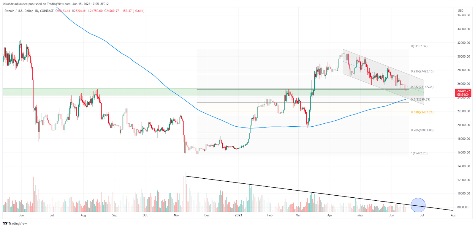 Après avoir perdu 3 % de sa valeur, Bitcoin a clôturé la journée du jeudi 15 juin autour du niveau de support de 25 100 $ (zone verte). Ce dernier coïncide avec le niveau de retracement de 0,382 Fib, qui maintient le mouvement haussier depuis janvier.