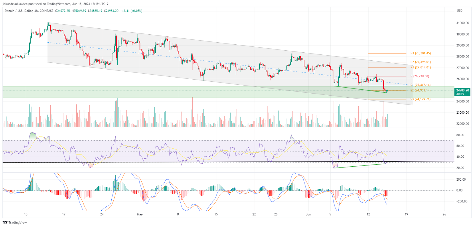 Le graphique sur quatre heures donne des prévisions légèrement plus haussières. Tout d’abord, Bitcoin évolue depuis longtemps dans un canal parallèle descendant. Ce schéma est haussier, car il conduit souvent à une flambée du cours.