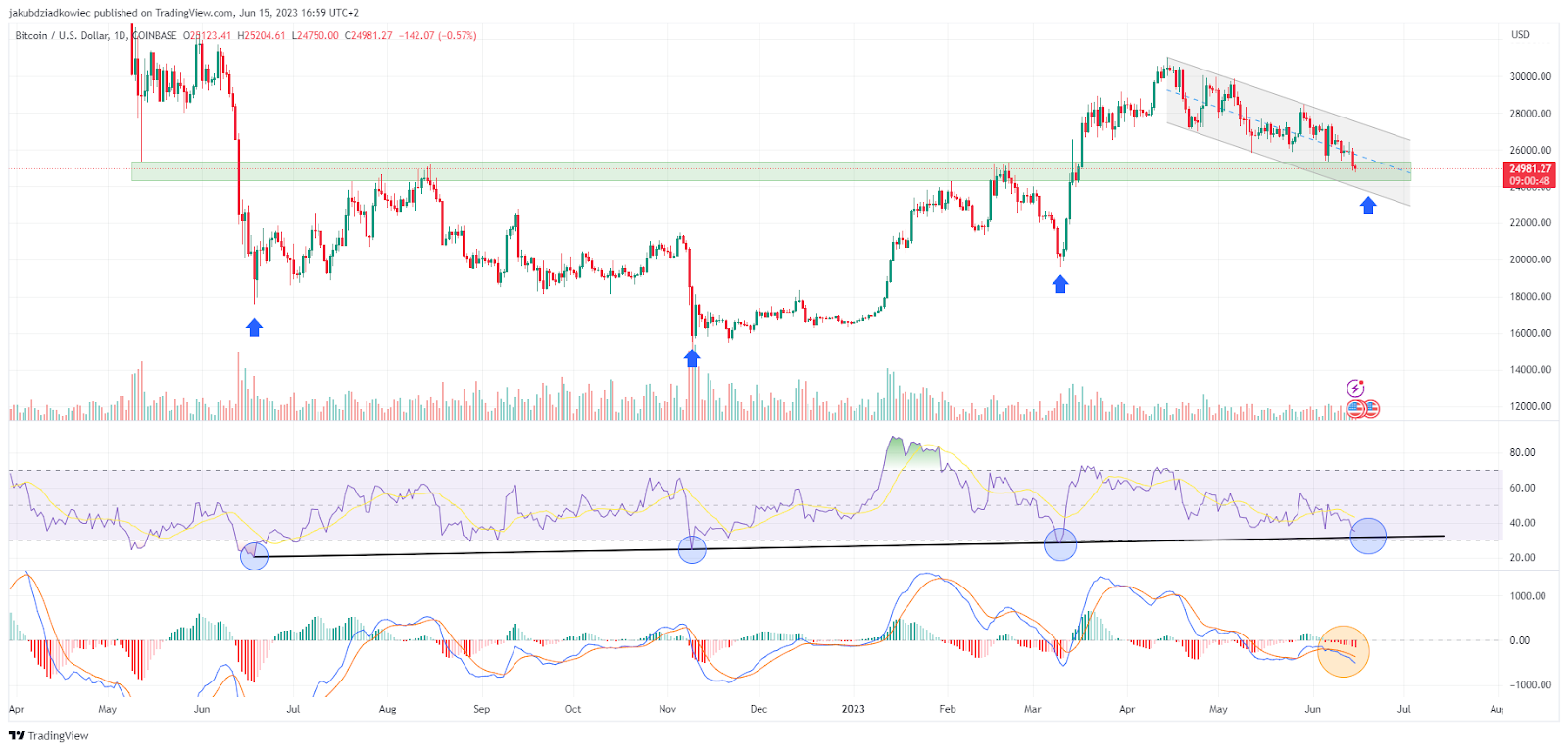 Actuellement, la ligne se trouve juste au-dessus du territoire de survente, près de 30. Ainsi, bien que les perspectives d’évolution de Bitcoin soient plutôt baissières, le support du graphique RSI pourrait entraîner un rebond et une reprise de la tendance haussière.