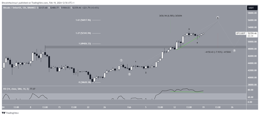 Le niveau le plus probable pour le sommet du mouvement haussier se situe à 56 000 $, créé par le niveau de résistance de retracement Fib externe de 1,61 de la baisse précédente. Il se situe à près de 7 % au-dessus du prix actuel. Ensuite, le prix du BTC pourrait corriger dans ce qui est la quatrième vague.