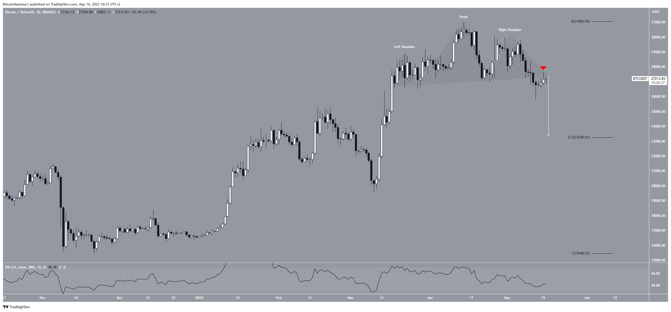 Suite à un rebond, le cours Bitcoin a validé le cou de la structure en tant que résistance (flèche rouge) le 15, chutant au cours des 24 heures suivantes. Si cette structure s’avère correcte, cela pourrait mener à de plus amples pertes.