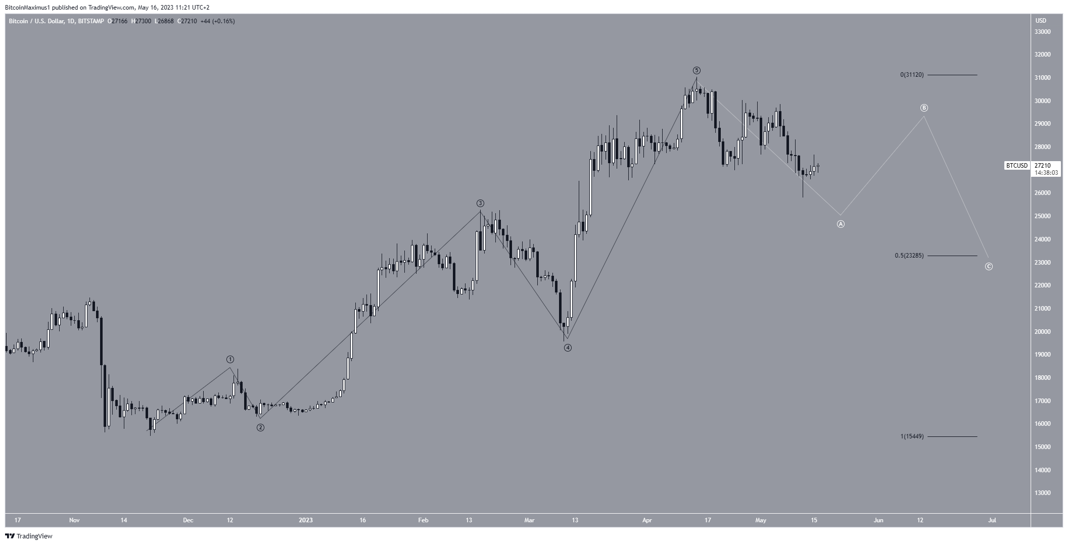 Le décompte baissier de Bitcoin suggère que le cours a complété un mouvement de hausse en cinq vagues (en noir). Dans ce cas, il se trouverait maintenant dans une correction en A-B-C (en blanc).