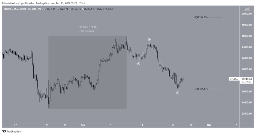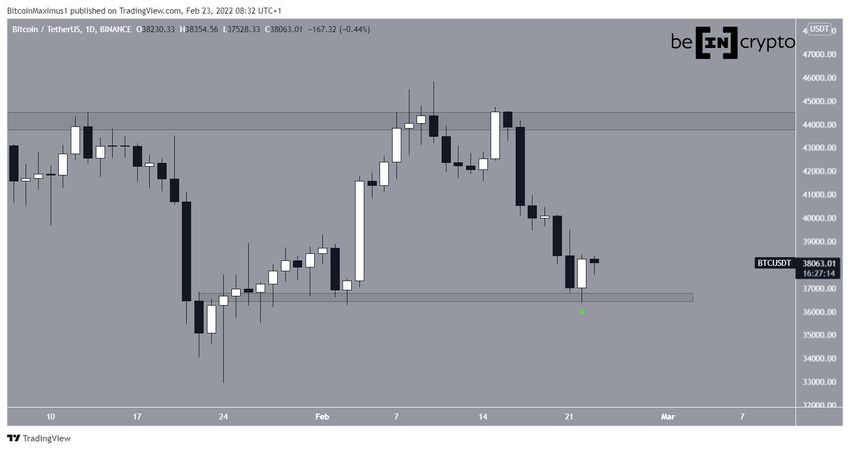 Le cours du BTC s’est considérablement accru le 23 février, avec un rebond à la zone de support située à 36 600 $ (flèche verte). Cette zone sert de support depuis le début du mouvement ascendant de Bitcoin, qui a commencé le 24 janvier.