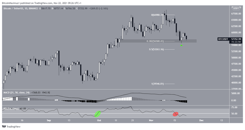 Le graphique quotidien montre que le BTC s’échange juste au-dessus du support horizontal situé à 56 500 $. Il s’agit de la zone de support du retracement de Fibonacci 0,382 (en blanc) obtenu en mesurant la dernière portion du mouvement de hausse.