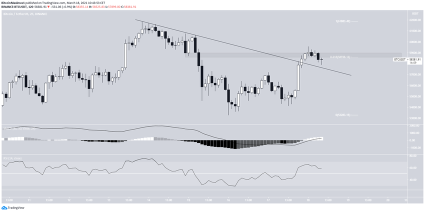 Le graphique sur deux heures montre que le BTC a dépassé une ligne de résistance descendante de court terme.