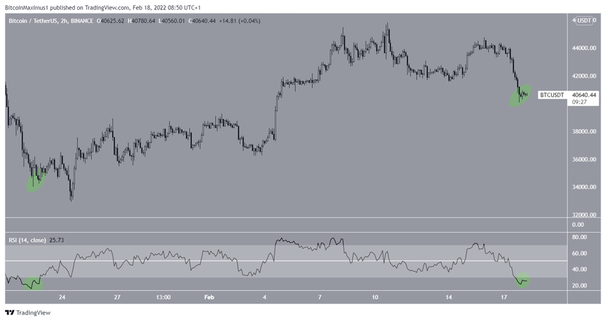 Une analyse du graphique sur deux heures ne montre pas de divergences haussières, ce qui serait le signe qu’un mouvement de hausse pourrait encore être à prévoir. Cependant, il est intéressant de noter que le RSI est tombé en territoire de survente (cercle vert). La dernière fois que cela s’est produit, le cours du BTC est descendu à un considérable plancher local.