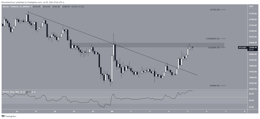 Le graphique sur deux heures montre que le BTC a dépassé une ligne de résistance descendante, et il cherche maintenant à dépasser la zone de résistance horizontale des 20 400 $. Cette zone se situe entre les niveaux de retracement de Fibonacci 0,5-0,618, ce qui la rend d’autant plus importante.